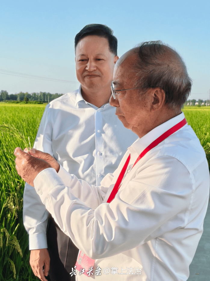 ▲中国科学院院士、福建农业科学院研究员谢华安(前)到正丰万亩稻田考察,正丰集团董事长王清正介绍相关情况