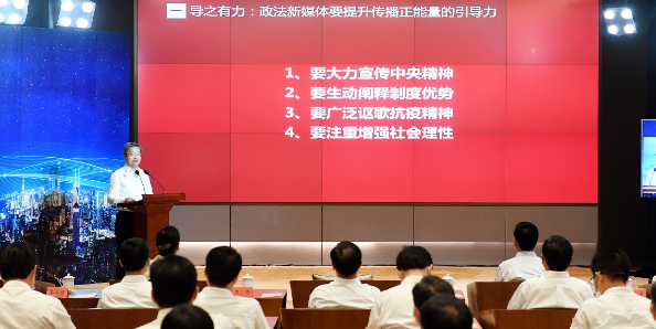 今天‘四个一百’优秀账号齐聚云端,集中展示了政法新媒体创新发展的成果,是政法新媒体实现跨越式发展,舆论传播力、社会影响力、法治公信力不断提升的最直接、最有力的事实证明。”陈一新强调,近年来,随着互联网新技术新应用迅猛发展,网络业态、传媒形态、舆论生态发生了深刻变化。政法战线作为国家安全的捍卫者、社会安定的促进者、人民安宁的守护者,既要在网下打好法律仗,又要在网上打好舆论仗。政法宣传工作者要坚持以习近平新时代中国特色社会主义思想为指导,进一步增强“四个意识”、坚定“四个自信”、做到“两个维护”,肩负起做强做优做响政法新媒体的使命任务,不断创新政法新媒体运营模式、表达方式、传播范式,着力营造良好的政法舆论环境,为夺取疫情防控和实现今年经济社会发展目标的双胜利作出新贡献。